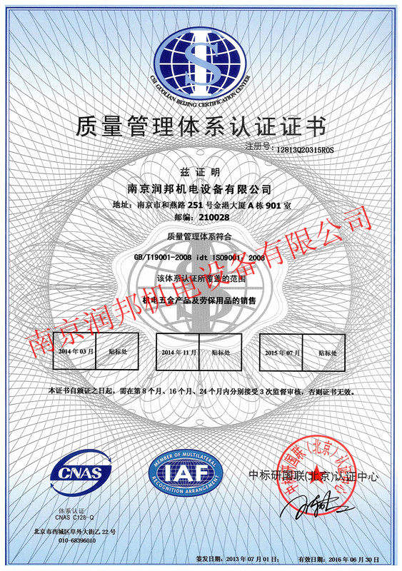 2013年7月1日,我公司順利通過ISO9001質(zhì)量管理體系認(rèn)證,并獲取以下證書: