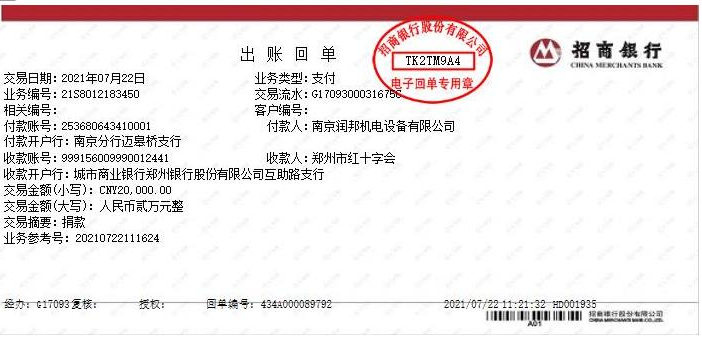 災(zāi)難面前,全國上下風(fēng)雨同行,同舟共濟(jì)。7月22日,潤邦公司決定盡我們的綿薄之力馳援河南,通過鄭州市紅十字會(huì)捐款人民幣兩萬元整,用于保障受災(zāi)地區(qū)人民群眾的生命安全、緊急救災(zāi)物資采購等,助力鄭州市防汛救災(zāi)工作。